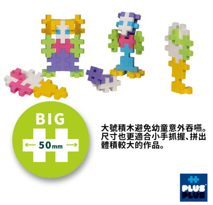 - BIG系列專爲幼童而設,尺寸比常規Plus Plus積木大,3歲或以上人士適用